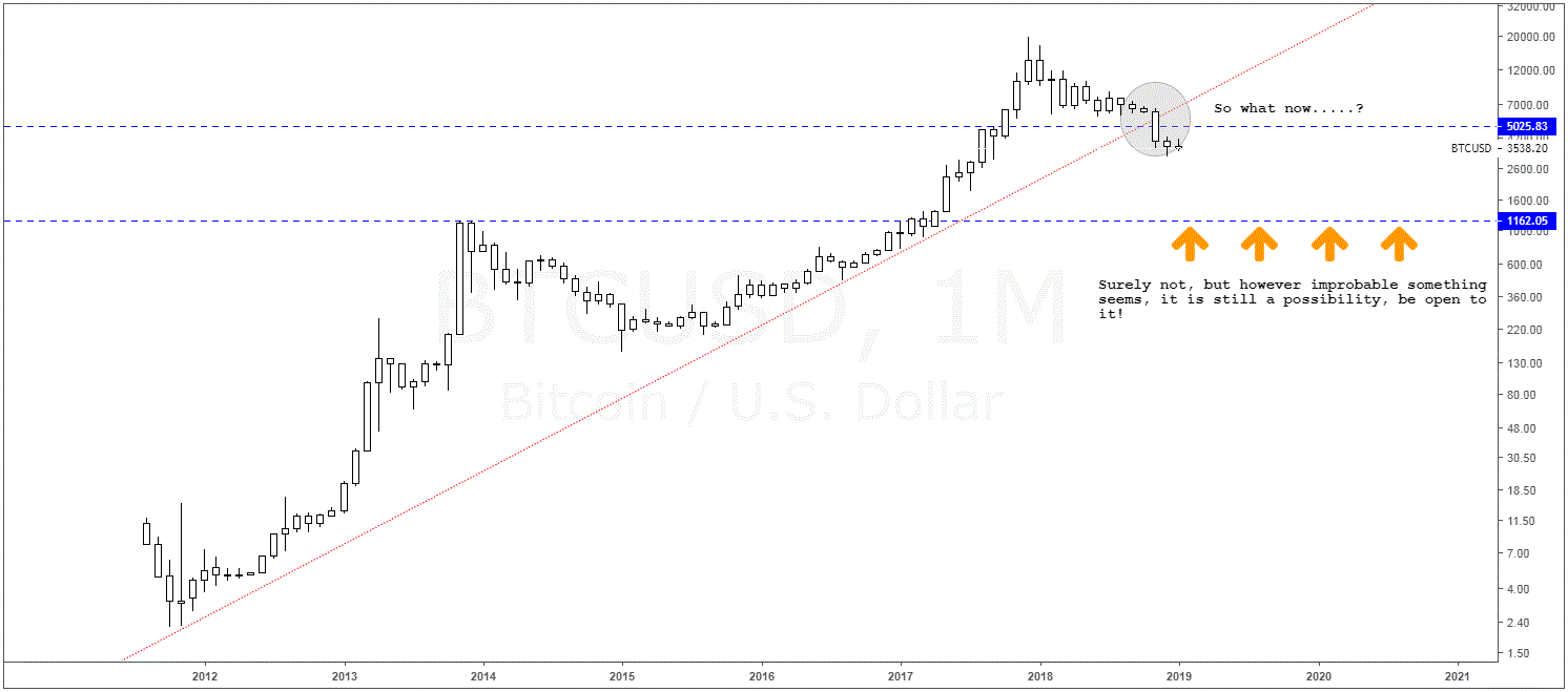 Well I can’t tell you it won’t. Anyone that tells you they know for sure where the price of BTC is going is either lying or deluded. So I’ll refrain form saying anything in that regard, above is the monthly view of BTC with a rough upward trend line that has been touched a few times but finally broke towards the end of 2018, is this important? I’m not sure tbh, there’s not much we can do about it now anyway so we move on.